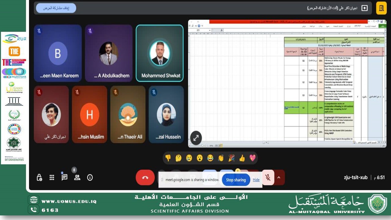 عقدت للجنة العلمية في رئاسة جامعة المستقبل ورشة إلكترونية بالتعاون مع الوحدة البحثية في كلية العلوم والكادر التدريسي، لمناقشة آليات تطوير العمل البحثي ومتابعة تنفيذ الخطة البحثية في الأقسام العلمية.