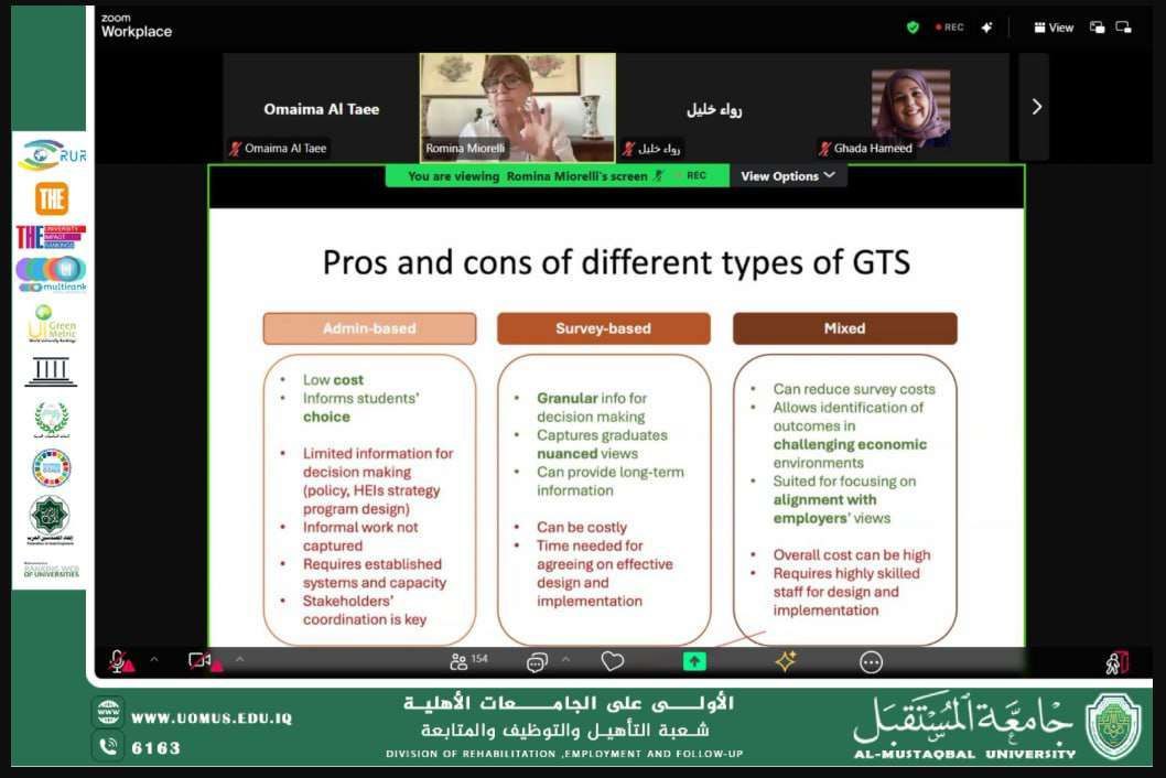 في إطار التزامها بتعزيز مواءمة مخرجات التعليم العالي مع متطلبات سوق العمل، شاركت مسؤولة شعبة التأهيل والتوظيف والمتابعة في جامعة المستقبل في الورشة الإلكترونية التفاعلية التي عُقدت ضمن سلسلة ندوات دولية نظمها البنك الدولي عبر منصة Zoom، تحت عنوان: "لماذا يُعد تتبع الخريجين أمرًا حيويًا؟ وما هي أفضل الممارسات العالمية في هذا المجال؟" وشهدت الورشة حضورًا متميزًا لعدد من الخبراء الدوليين في سياسات التعليم، من أبرزهم: Romina Miorelli، خبيرة دولية متخصصة في سياسات التعليم وتتبع الخريجين. Cornelia Jesse، ممثلة عن وزارة التعليم العالي الفرنسية، وخبيرة في مواءمة التعليم العالي مع سوق العمل الأوروبي. ركّزت الجلسات على تحليل النماذج الثلاثة الأساسية لأنظمة تتبع الخريجين (الإداري، المسحي، والنموذج المختلط)، واستعرضت أبرز المزايا والتحديات المرتبطة بتطبيق كل نموذج، خاصةً في البيئات الاقتصادية المتغيرة. كما جرى تسليط الضوء على النموذج الفرنسي كنموذج دولي رائد في إدارة قواعد بيانات الخريجين وتحليلها بشكل دقيق وفق التخصص، المؤسسة، والمستوى الدراسي. وتناولت النقاشات أهمية بيانات التتبع في رسم السياسات الجامعية المستقبلية، وتوجيه الطلبة نحو التخصصات ذات فرص التوظيف الأعلى، بالإضافة إلى دورها في دعم مواقع الجامعات في التصنيفات العالمية المرموقة مثل QS وTHE، لا سيما في مؤشري سمعة الخريجين (Employer Reputation) ونتائج التوظيف (Employability Outcomes). كما أُكد على ضرورة إشراك مختلف الأطراف المعنية، من طلبة وخريجين وصناع قرار، في تطوير وتفعيل هذه الآليات لضمان فعاليتها وموثوقيتها. وفي ختام الورشة، جدّدت شعبة التأهيل والتوظيف والمتابعة في جامعة المستقبل التزامها بتبني أفضل الممارسات العالمية في هذا المجال، والعمل على تطوير منصة إلكترونية وطنية لتتبع الخريجين، بالشراكة مع الكليات والجهات ذات العلاقة، بما يسهم في رفع كفاءة مخرجات الجامعة، وتعزيز جاهزيتها لمواكبة متغيرات سوق العمل المحلي والدولي.