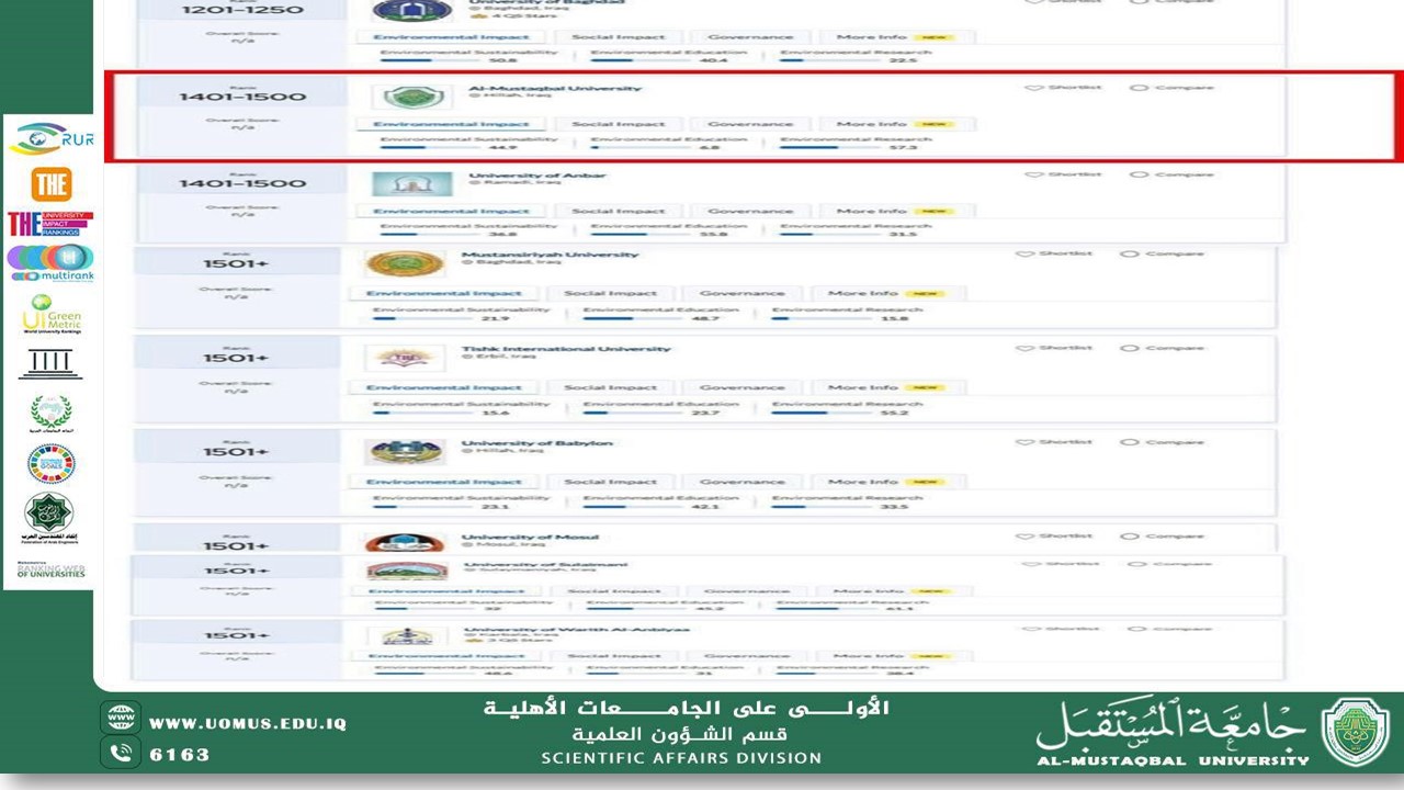على الصعيد الوطني، تمكنت جامعة المستقبل من تحقيق المركز الأول بين الجامعات الخاصة في العراق، والمركز الثاني على مستوى العراق من بين 9 جامعات عراقية فقط تم إدراجها في التصنيف، ما يعكس ريادة الجامعة وتميزها الأكاديمي في المشهد التعليمي العراقي.