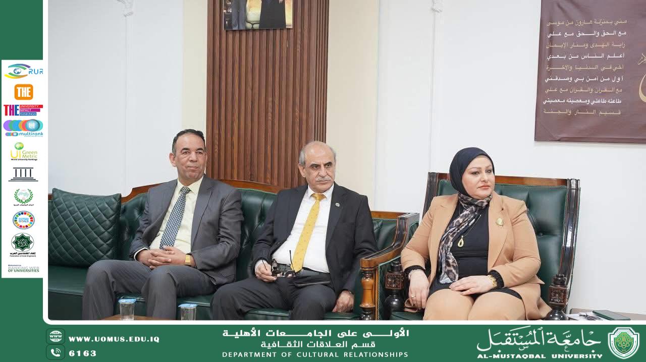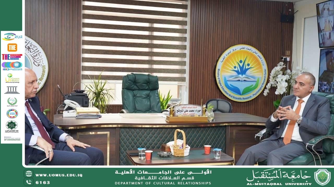 استقبل مركز البحوث النفسية التابع لهيئة البحث العلمي وفدًا رفيع المستوى من جامعة المستقبل، ضم كلًا من الأستاذ الدكتور مظفر صادق الزهيري مدير الإشراف العلمي والأكاديمي ، والأستاذ الدكتور طارق جواد الموسوي مدير قسم الشؤون العلمية، والدكتور سمير بدراوي مدير قسم العلاقات الثقافية.
