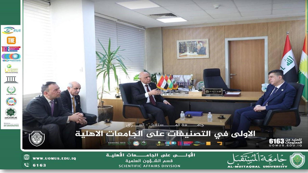 من جانبه، رحّب رئيس جامعة السليمانية بالوفد الزائر، مثمناً المكانة الأكاديمية التي باتت تتمتع بها جامعة المستقبل محلياً ودولياً بعد حصولها على مراتب متقدمة في عدد من التصنيفات العالمية. وأبدى استعداد الجامعة للمضي نحو توقيع اتفاقية تعاون علمي وثقافي خلال الفترة المقبلة، بما يفتح المجال لتبادل الخبرات وتطوير البرامج الأكاديمية بين الجانبين.