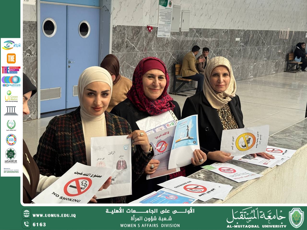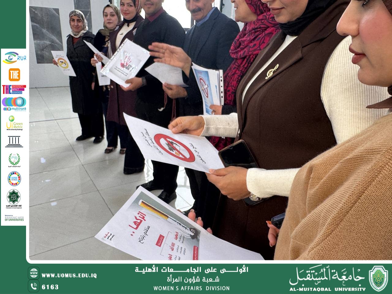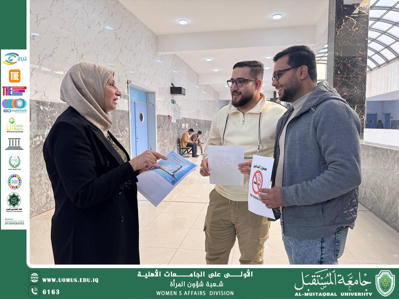 برعاية السيد رئيس جامعة المستقبل الاستاذ الدكتور حسن شاكر مجدي المحترم نظمت شعبة شؤون المرأة في جامعة المستقبل بالتعاون مع مسؤول وحدة شؤون المرأة في كلية التربية أ.د. ثناء بهاء الدين بتقديم حملة توعوية تثقيفية بعنوان (التدخين و مضاره الصحية وكيفية تجنبه وتأثيره على استدامة الصحة الجسدية والنفسية للفرد والمجتمع )وذلك في يوم الأحد المصادف ٧/ ١٢ / ٢٠٢٥ الساعة الحادية عشر صباحا. في البناية الأنسانية الطابق الخامس ، وقد شارك في حملة التوعية مسؤولات لجان شؤون المرأة في جميع أقسام الكلية فضلا عن مشاركة رؤساء الأقسام وبعض تدريسي وطلبة الكلية، ويقع هذا النشاط ضمن الخطة الاستراتيجية الوطنية للمرأة العراقية / المحور الثالث -الفقرة( ١ ) بهدف تعزيز الوعي المجتمعي بالآثار السلبية للتدخين.