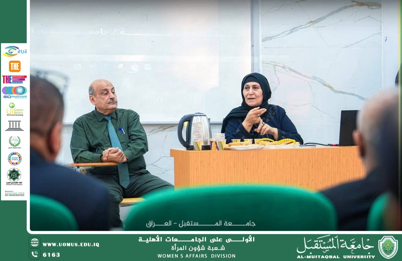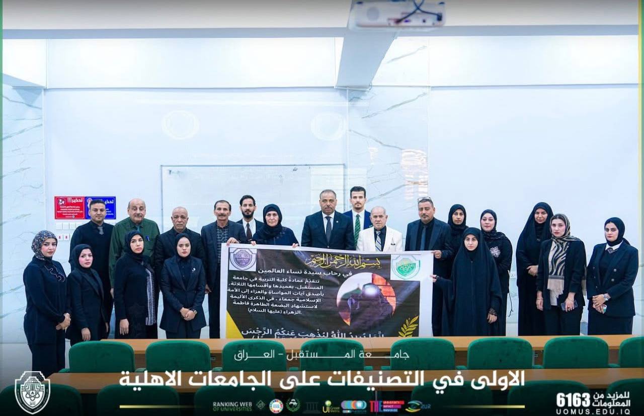 برعاية السيد رئيس جامعة المستقبل الأستاذ الدكتور حسن شاكر مجدي المحترم، وبإشراف السيد عميد كلية التربية الأستاذ المساعد الدكتور أحمد روضان سلمان المحترم، نظمت وحدة شؤون المرأة في كلية التربية برئاسة أ. د. ثناء بهاء الدين ندوة توعوية بمناسبة ذكرى استشهاد سيدة نساء العالمين فاطمة الزهراء (عليها السلام)، لتسليط الضوء على الجوانب المضيئة من حياة السيدة الزهراء (عليها السلام)،واستذكار سيرتها العطرة وما تمثله من رمز للمرأة المعطاء المخلصة المضحية المؤمنة الصبورة على الشدائد. وتم إنجاز النشاط يوم الأربعاء المصادف ٥ / ١٢ / ٢٠٢٥ الساعة الحادية عشر صباحا في البناية الأنسانية القاعة ٥٠٥ . وساهم في الندوة كل من: أ.د. ثناء بهاء الدين، وأ.د. عبد السلام جودت، وم.م. التفات عليوي، وم.م شدن صلاح.