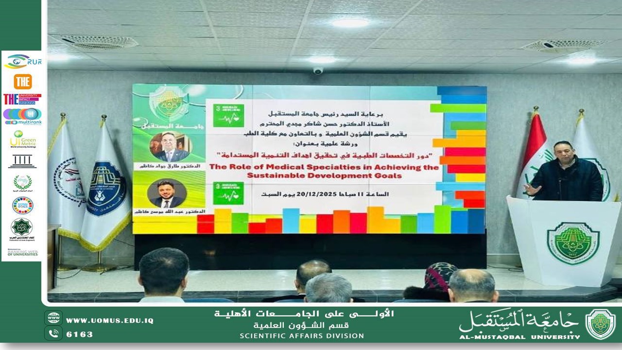 برعاية كريمة من السيد رئيس جامعة المستقبل الأستاذ الدكتور حسن شاكر مجدي المحترم، وبإشراف مباشر من قسم الشؤون العلمية، نظم القسم ورشة علمية تخصصية بالتعاون مع كلية الطب العام في جامعة المستقبل ، وذلك ضمن إطار تعزيز التكامل العلمي بين الأقسام والكليات ودعم الأنشطة الأكاديمية الهادفة.