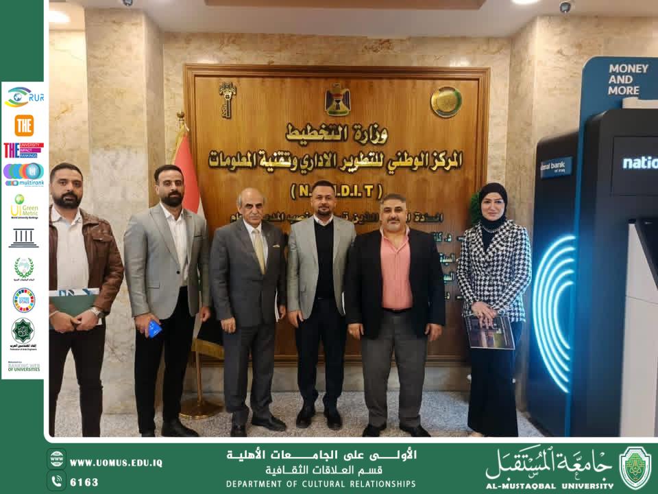 في تجسيدٍ واضح لرؤية جامعة المستقبل في بناء شراكات استراتيجية فاعلة مع المؤسسات الوطنية الرصينة، شارك وفد الجامعة في لقاء نوعي مع المركز الوطني للتطوير الإداري وتقنية المعلومات في وزارة التخطيط، خُصِّص لبحث آفاق التعاون الثنائي وتعزيز التكامل المؤسسي في مجالات التدريب والتطوير وبناء القدرات البشرية.