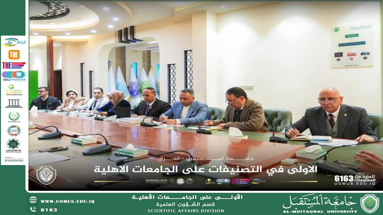 Al-Mustaqbal University held an expanded meeting at the beginning of 2026 to review and evaluate academic and institutional performance, as part of its ongoing efforts to enhance the quality of education and improve the efficiency of scientific and administrative work. The meeting was chaired by the President of the University, Professor Dr. Hassan Shaker Majdi, and attended by directors of departments and academic centers at the University Presidency. The meeting was dedicated to discussing mechanisms for institutional follow-up and implementation, as well as assessing the level of achievement attained, in line with the University’s strategic vision and development plans for the coming phase Participants included the directors of the Energy Research Center, the Artificial Intelligence Research Center, and the Continuing Education Center, along with representatives from the Departments of Scientific Affairs, Cultural Relations, Quality Assurance, University Performance, Studies and Planning, Qualifications, Employment and Follow-up, Women’s Affairs, Sustainability, and Educational Guidance. The meeting was also attended by the Director of Scientific and Academic Supervision, Professor Dr. Muzaffar Sadiq Al-Zuhairi The meeting opened with remarks by the University President, in which he extended his congratulations to the university community of faculty members, staff, and students on the occasion of the new year. He also commended the major qualitative achievements accomplished during the previous period and praised the institutional efforts that contributed to these successes Professor Dr. Hassan Shaker Majdi emphasized the importance of adopting a clear institutional methodology for documenting scientific and academic events and activities, and of continuing to monitor the implementation of approved plans within the colleges to ensure that objectives are achieved within the specified timeframes. He further stressed the need to review and evaluate the outcomes of initiatives previously launched by the University and to further develop them in a manner that enhances their sustainability and achieves long-term institutional impact The University President noted that the upcoming phase requires greater focus on sustaining strategic initiatives, most notably the Future Sustainability Ambassadors Initiative, the Smart University Initiative, the localization of scientific research, and the enhancement of international cooperation. He underscored the importance of preparing periodic reports that clearly demonstrate progress and achievements across these tracks This meeting comes as part of a series of coordination meetings adopted by Al-Mustaqbal University to reinforce a culture of quality and strategic planning, and to strengthen integration between academic and administrative functions, supporting its journey toward sustainable institutional excellence