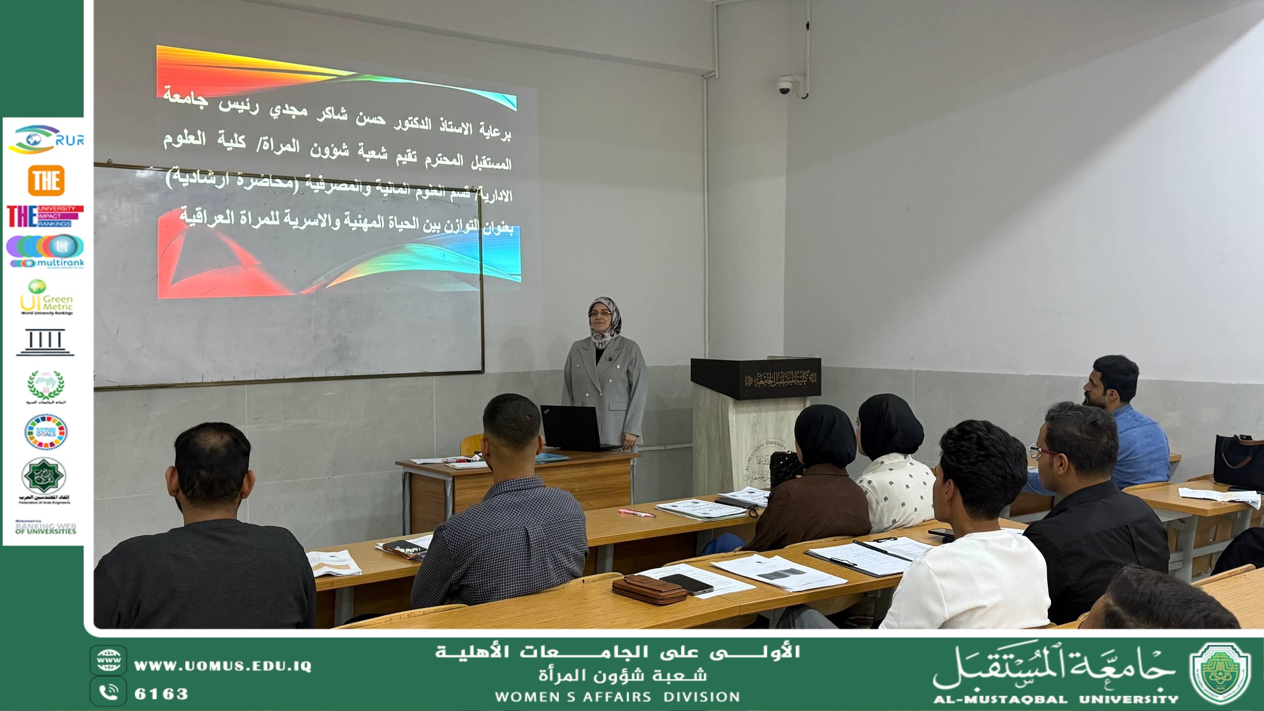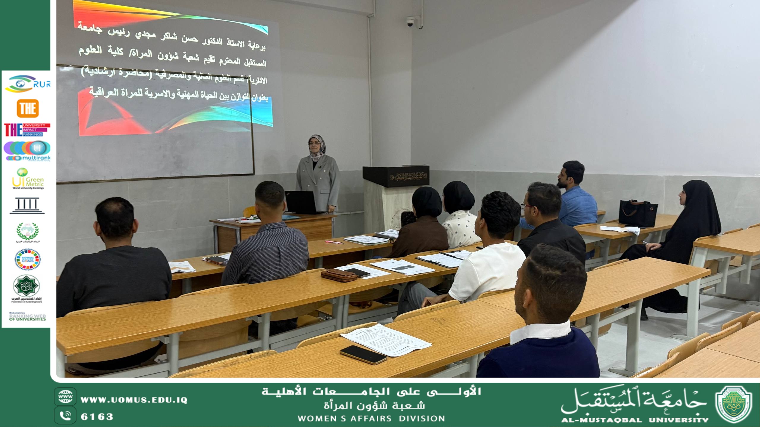 Under the patronage of Professor Dr. Hassan Shaker Majdi, President of Al-Mustaqbal University, the Women’s Affairs Division, in cooperation with the Women’s Affairs Unit at the College of Administrative Sciences / Department of Financial and Banking Sciences, organized an educational workshop entitled: “Balancing Professional and Family Life for Iraqi Women,” delivered by Assistant Lecturer Najlaa Salem Mousa, on Sunday, March 8, 2026. The workshop aimed to introduce the concept of balancing work responsibilities with family life, while highlighting the key challenges faced by Iraqi women in this regard. It also addressed ways to enhance time management skills and organize responsibilities through the support of both family and society for working women, in addition to presenting practical solutions that contribute to achieving this balance. This workshop was conducted as part of the implementation of the objectives of the Third National Plan for Women, with the aim of strengthening the role of women across various fields. #Ranked_first_among_private_universities_in_Iraq #Goal 5: Gender Equality