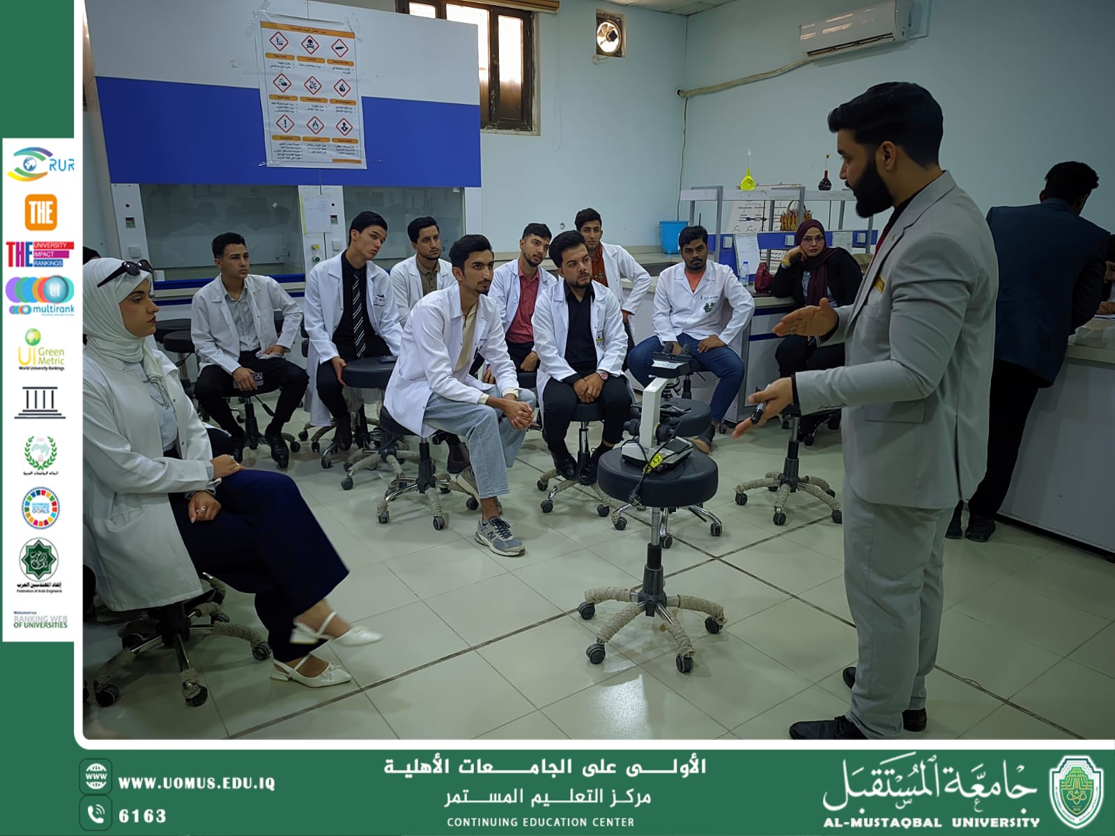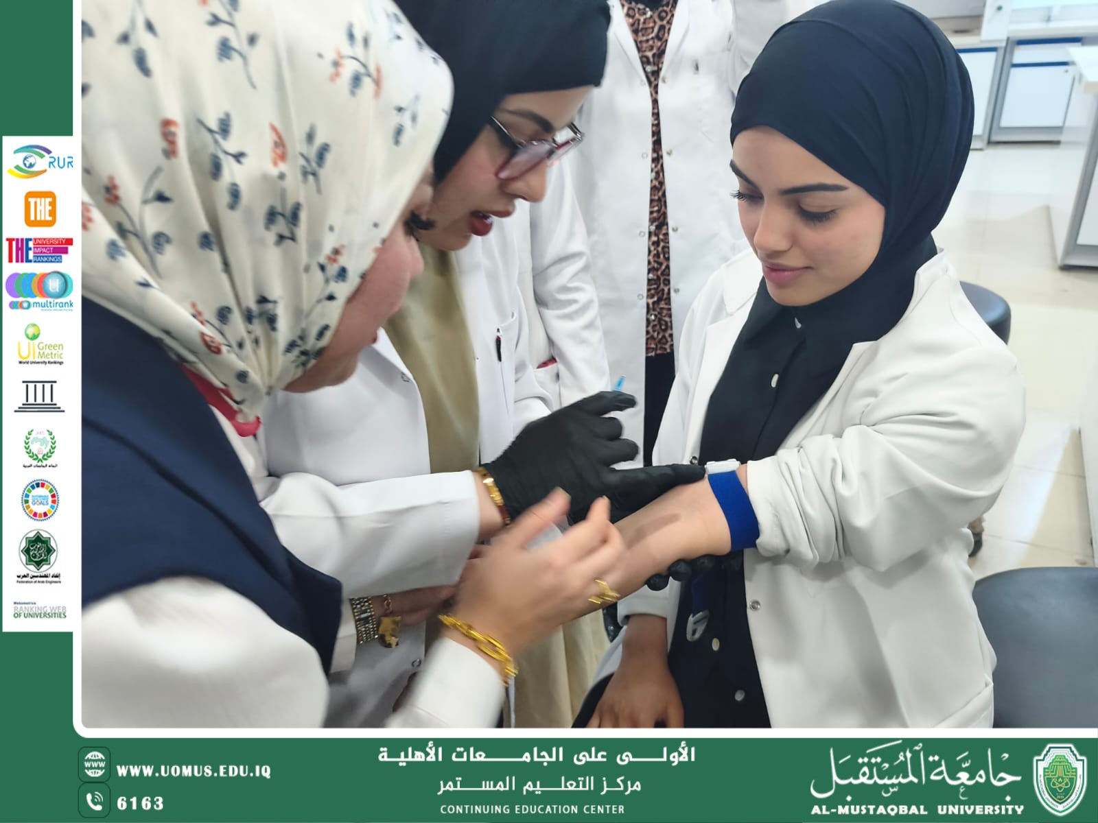 The Continuing Education Center at Al-Mustaqbal University, in cooperation with Ishraqa Scientific Organization for Education Development, organized a practical training workshop entitled “Fundamentals of Pathological Analysis”, held at the university’s halls in Babil Province, with the participation of a number of medical students and graduates. The workshop aimed to develop participants’ practical skills and enhance their competencies in laboratory testing by providing hands-on training on the most important principles and procedures in pathological analysis. The workshop covered several key topics, including: Sample collection, blood drawing techniques (Capillary & Venipuncture), blood smear analysis, urine analysis (physical and microscopic examination), PCV testing, blood group analysis (ABO), as well as practical training on sample preparation for each participant. The workshop was distinguished by its strong focus on practical application, allowing participants to engage directly in hands-on activities. This contributed to strengthening their scientific understanding and improving their professional skills, preparing them for the labor market with confidence and competence. This workshop comes as part of a series of training activities organized by the Continuing Education Center at Al-Mustaqbal University, aimed at advancing the academic and practical level of students and graduates and meeting the needs of the medical job market.