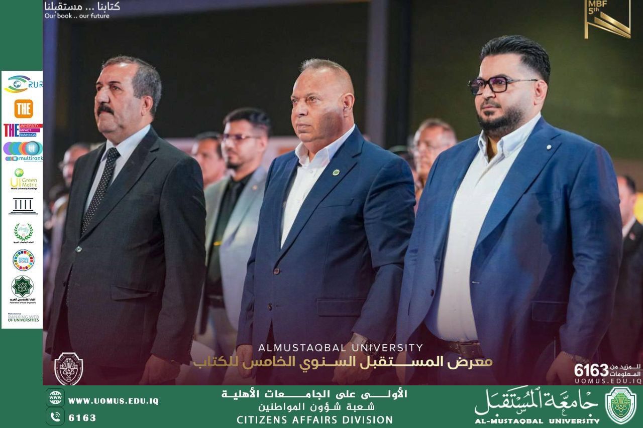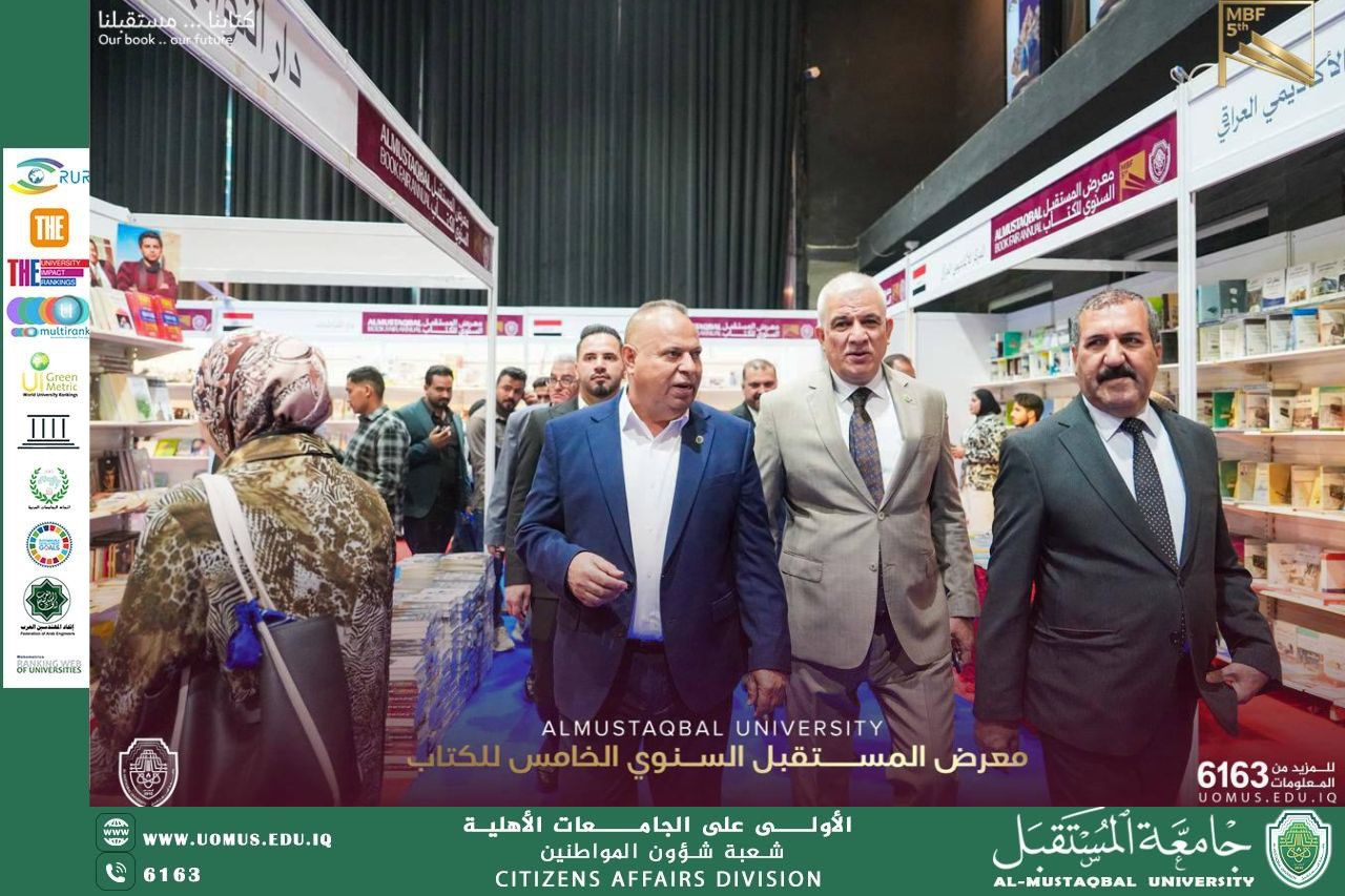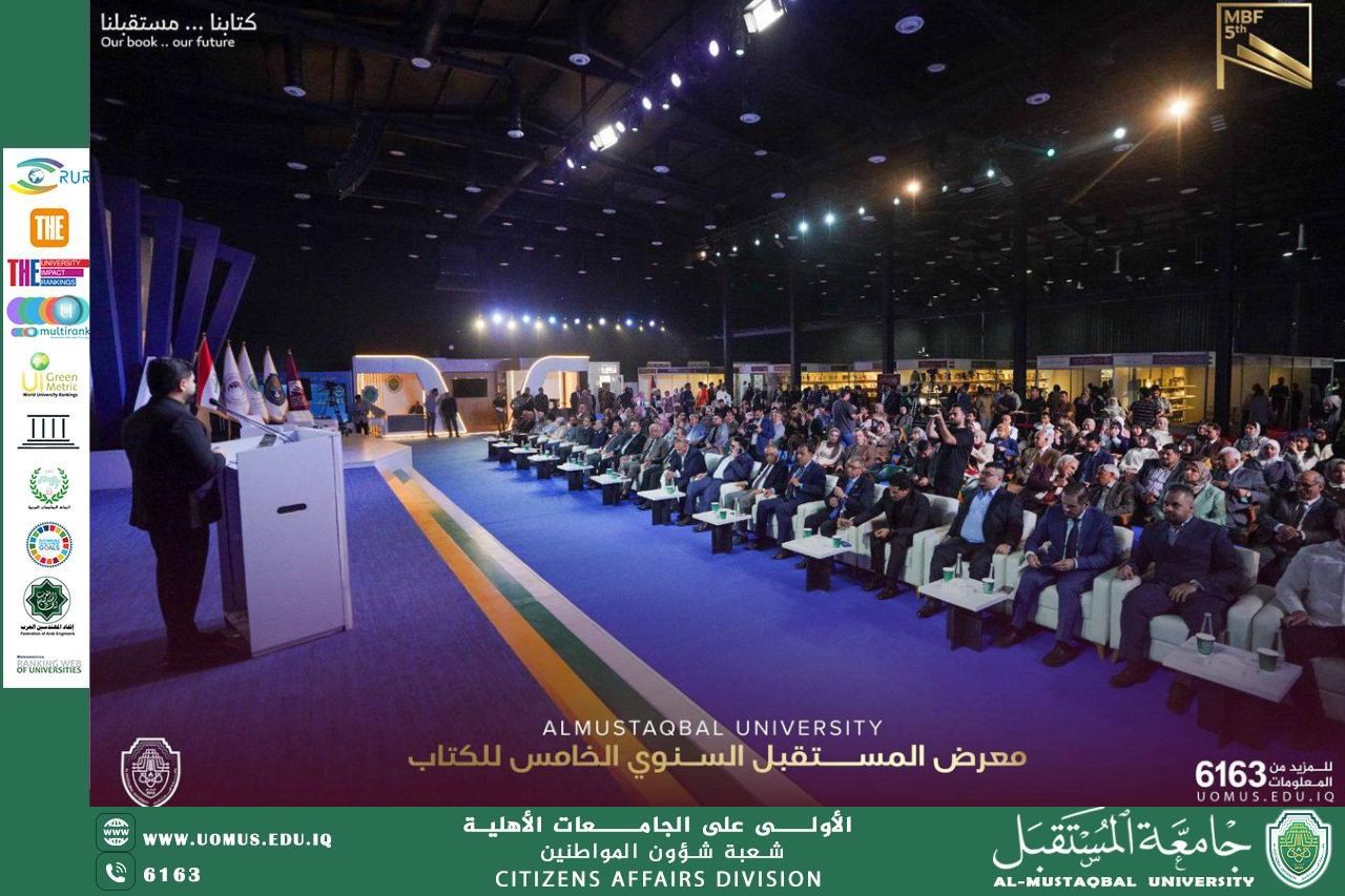 Under the patronage of the President of Al-Mustaqbal University, Professor Dr. Hassan Shaker Majdi, the activities of the Fifth Annual Al-Mustaqbal Book Fair were inaugurated on Saturday morning, April 4, 2026, under the slogan “Our Book, Our Future,” in the presence of a number of the university’s faculty members, students, and a distinguished group of intellectuals and individuals interested in cultural affairs. The opening ceremony included a speech delivered on behalf of the university presidency by Professor Dr. Abbas Abd Ali Al-Bawi, Assistant President of the University for Scientific Affairs, in which he emphasized the importance of the fair as a knowledge platform that contributes to promoting culture, spreading scientific awareness, and strengthening students’ connection with books as one of the most important sources of knowledge. The fair features the participation of 25 publishers from various countries, presenting a wide range of scientific and literary publications, in addition to a diverse cultural program that includes meetings with writers and poets, theatrical performances, and art exhibitions. The event also included the launch of an initiative to distribute free book purchase vouchers, aiming to encourage students to read and promote a culture of knowledge and learning among them