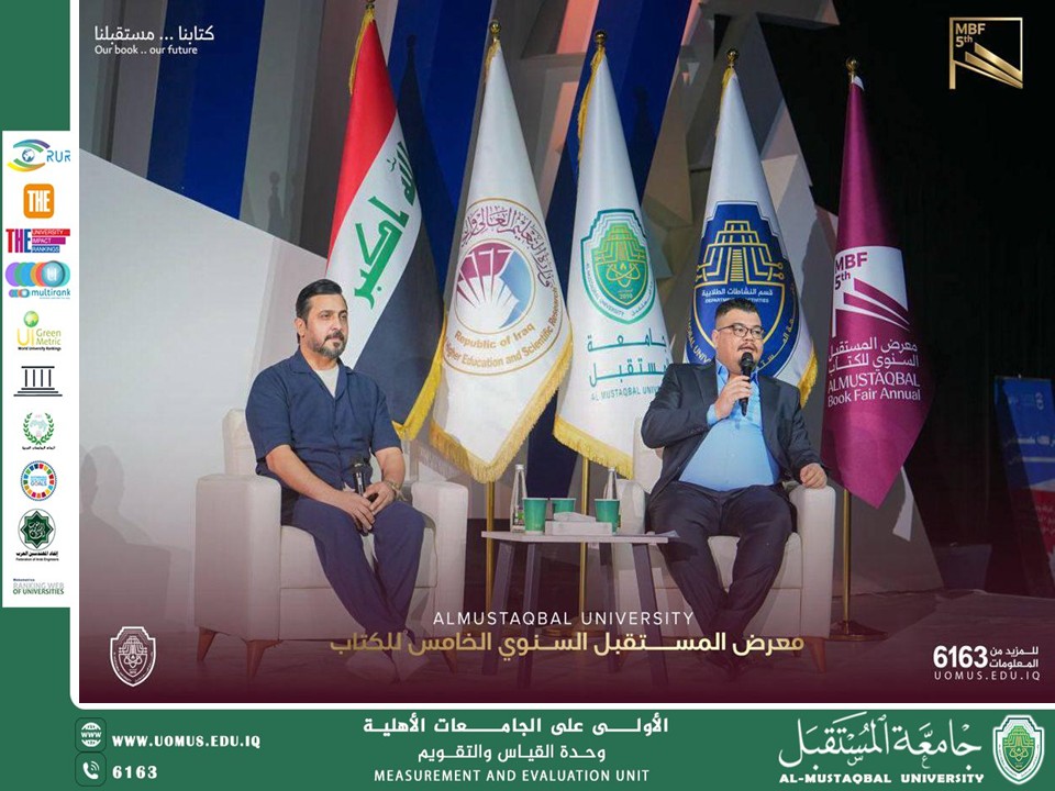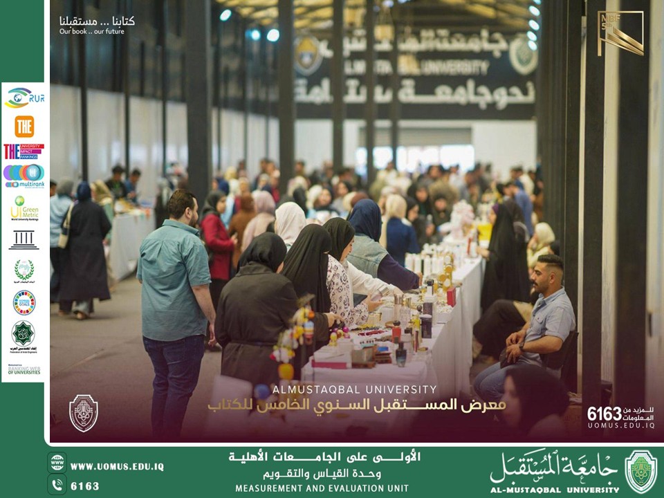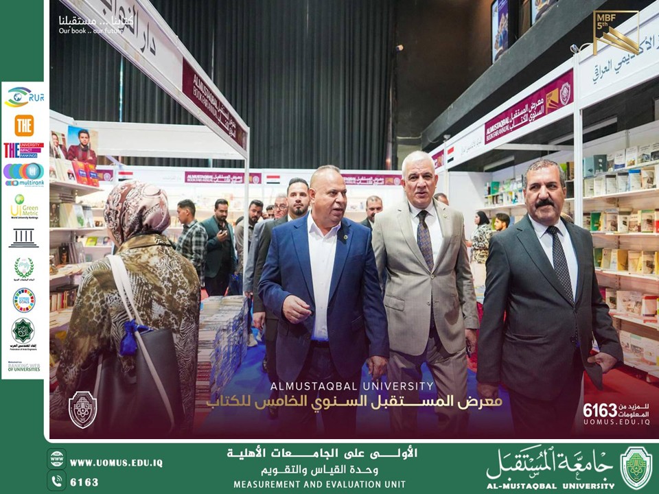 Al-Mustaqbal University Initiated the activities of its Fifth Annual Book Fair on Saturday morning, April 4, 2026, under the slogan “Our Book… Our Future,” under the patronage of the University President, Professor Dr. Hassan Shaker Majdi. The event drew wide participation from faculty members, students, and a distinguished group of intellectuals and individuals interested in cultural affairs, making it one of the most prominent cultural events among Iraqi universities. The opening ceremony featured a speech delivered on behalf of the University Presidency by Professor Dr. Abbas Abdul Ali Al-Bawi, Assistant President for Scientific Affairs. In his remarks, he emphasized that the fair represents a leading knowledge platform that reflects the university’s commitment to supporting culture, promoting scientific awareness, and strengthening students’ relationship with books as a fundamental pillar in building societies. The fair brings together 25 publishing houses from various countries, offering a rich selection of academic and literary publications, alongside a comprehensive cultural program that includes meetings with writers, poets, and authors, as well as distinguished theatrical performances and inspiring art exhibitions. The event also witnessed the launch of an initiative to distribute free book purchase coupons, aimed at encouraging students to read and fostering a culture of knowledge. The fair will continue for a full week, providing visitors with ample opportunity to explore the latest publications and engage in a variety of cultural activities. This event aligns with Al-Mustaqbal University’s vision of fostering an integrated academic and cultural environment. It targets students, the academic community, and those interested in cultural affairs, contributing to the preparation of a knowledgeable and aware generation capable of keeping pace with the rapid development of knowledge and shaping the future.