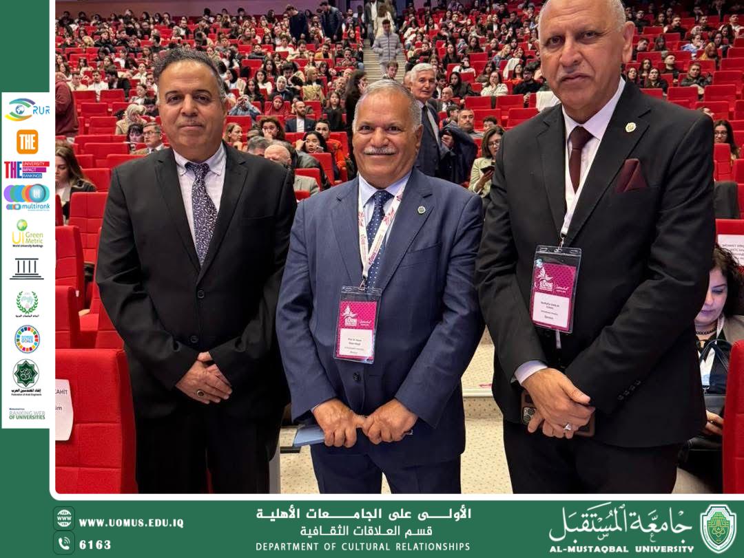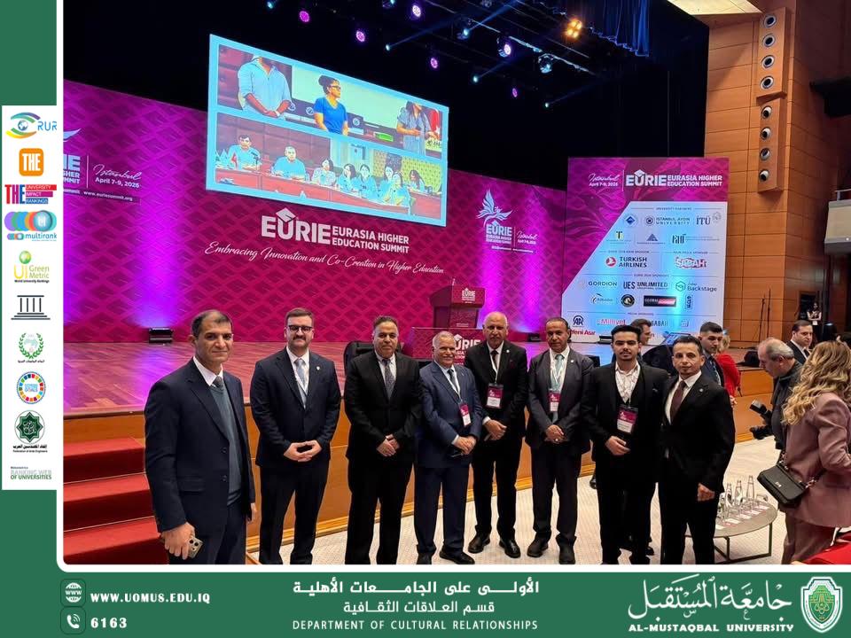 In line with its strategic vision to enhance international engagement and openness to global academic experiences, the President of Al-Mustaqbal University, Prof. Dr. Hassan Shakir Majdi, led a high-level academic delegation to participate in the opening session of the EURIE 2026 Summit, hosted in Istanbul. The summit witnessed broad participation from universities and educational and research institutions from across the world. The opening session brought together an eminent academic and governmental audience exceeding 2,000 participants, including university presidents, deans, professors, researchers, and higher-education experts. The event was also attended by the Turkish Minister of Higher Education and several members of the Turkish government, reflecting the growing importance of the summit as a prominent international platform for academic dialogue and the exchange of knowledge and expertise. The opening ceremony featured a series of keynote addresses delivered by distinguished international academic leaders, including Prof. Dr. Mustafa Aydın, Mr. Phil Baty, and Prof. Dr. Amr Ezzat Salama. In their remarks, the speakers emphasized the importance of expanding international cooperation among higher-education institutions and strengthening the exchange of academic knowledge and expertise. The Al-Mustaqbal University delegation included Prof. Dr. Muzaffar Sadiq Al‑Zuhairi, Assistant Prof. Dr. Ali Shakir Majdi, Assistant Prof. Dr. Azhar Mohsen Abd, and Prof. Dr. Salwan Obaid, in addition to a number of faculty members and academic staff. Commenting on this occasion, Prof. Dr. Hassan Shakir Majdi stated that Al-Mustaqbal University’s participation in the opening session of the summit represents an important step within the university’s ongoing efforts to strengthen its international presence and engage with advanced global educational experiences. He noted that such participation contributes to expanding opportunities for academic cooperation and establishing strategic partnerships with leading universities and educational institutions. He further added that participation in international events of this kind provides valuable opportunities to explore the latest global trends in higher education development, while also enhancing academic communication in ways that support the university’s journey toward achieving institutional excellence and academic leadership. #Ranked_first_among_private_universities_in_Iraq #Goal_17_Partnerships_for_the_Goals