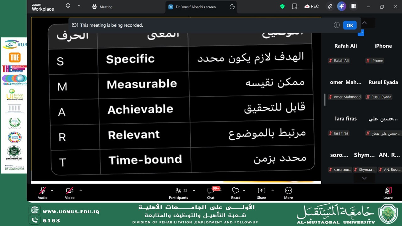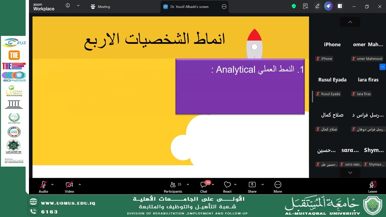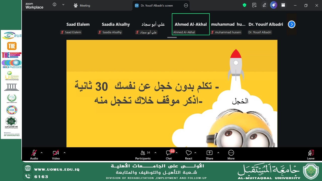 The training program for students and graduates of Al-Mustaqbal University continued its activities, as the fourth day commenced on Wednesday, April 8, 2026, under the patronage of the respected University President and the supervision of the Rehabilitation, Employment, and Follow-up Division, in cooperation with the Continuing Education Center and the Together Association for Human and Environmental Protection. The session witnessed active attendance and strong engagement from participants The fourth day focused on communication skills and problem-solving, along with part of presentation and public speaking skills Several key topics were highlighted, including The concept of effective communication and its importance in the workplace Listening and expression skills, and building successful professional relationships Strategies for analyzing problems and making appropriate decisions Teamwork and its role in overcoming challenges Fundamentals of presentation and public speaking and how to influence an audience Practical applications and interactive exercises to enhance participants’ skills The session saw remarkable interaction from students and graduates through discussions, questions, and participation in training activities, reflecting their eagerness to develop their personal and professional skills in line with labor market requirements The training program will continue in the coming days according to the planned schedule, aiming to enhance participants’ capabilities and refine their skills, ultimately preparing qualified young professionals capable of competing in the job market