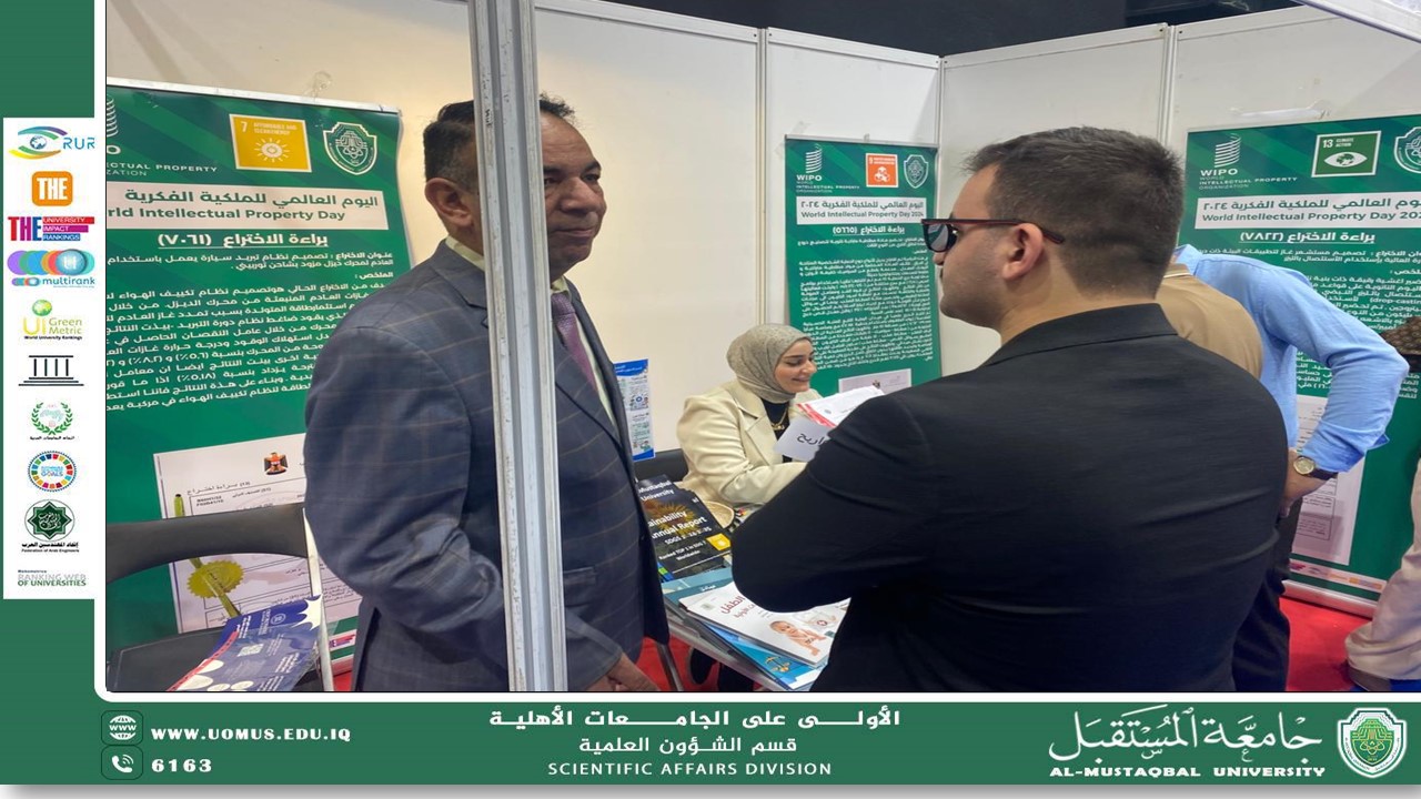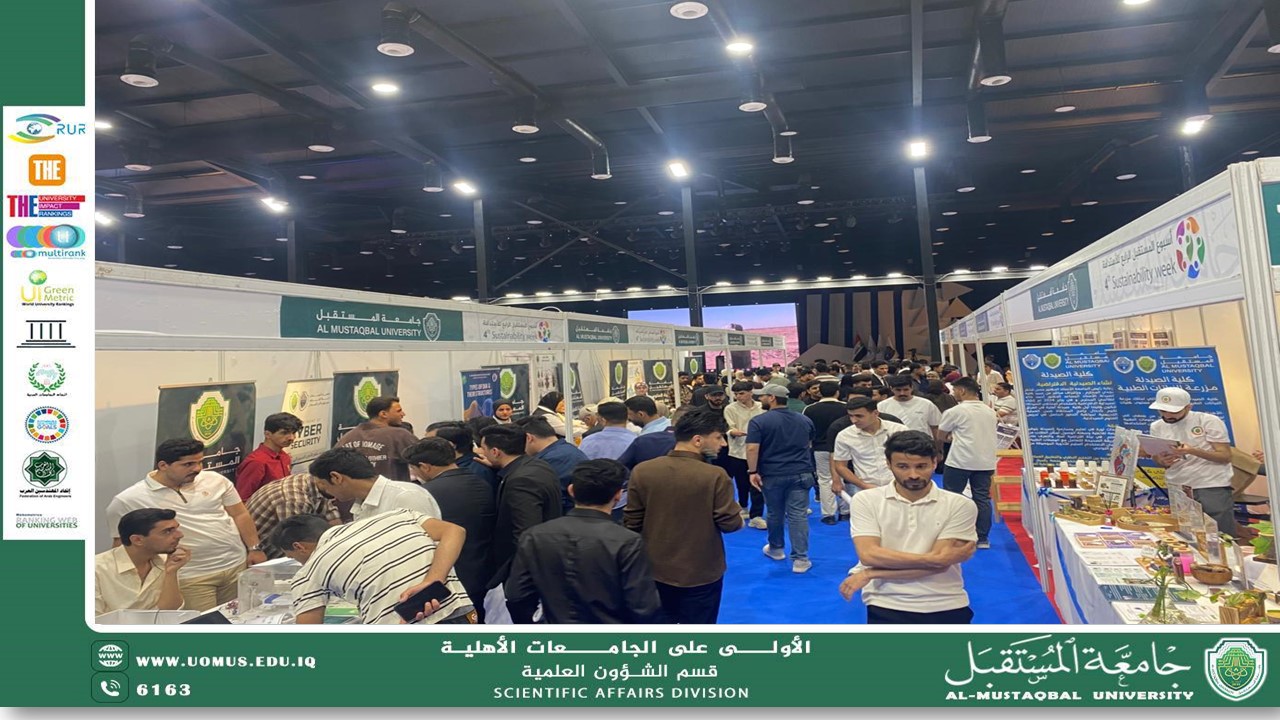 Al-Mustaqbal University witnessed, on Monday, April 13, 2026, the continuation of the second day of the Fourth Sustainability Week activities, with active participation from the Scientific Affairs Department. The department maintained its distinguished presence through its booth at the Student Activities Hall, offering knowledge-based activities that contribute to enhancing scientific awareness and sustainability concepts This participation comes as part of the department’s efforts to support scientific and cultural events, as the booth provided students and visitors with the opportunity to engage with the activities and explore a variety of scientific outputs The second day featured a diverse range of events, including the opening of artificial intelligence exhibitions, energy research exhibitions, and technology incubator showcases, in addition to the launch of the Administrative Sciences Conference and the Fuel and Energy Forum. It also included the attendance of the Health and Medical Technologies Alumni Forum and the Fine Arts College Hackathon, all within a vibrant and interactive atmosphere These activities aim to support innovation, promote a culture of scientific research, and encourage students to actively participate in events that help develop their skills and scientific capabilities The university presidency affirmed its continued support for the participation of scientific departments in various activities, enhancing their role in achieving sustainable development goals and building an integrated university environment