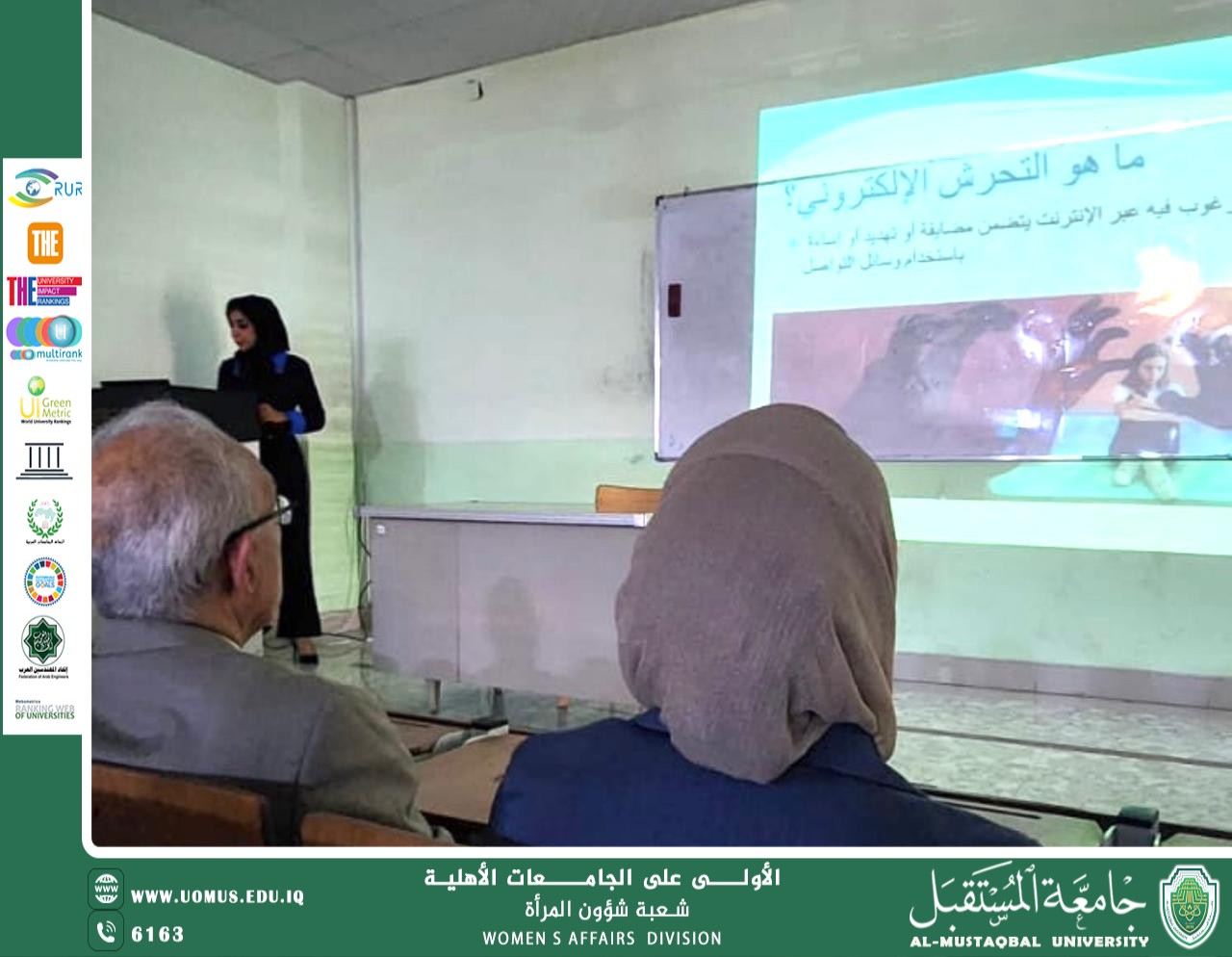 Under the patronage of the President of Al-Mustaqbal University, the Women’s Affairs Division, in cooperation with the College of Health and Medical Technologies / Department of Radiological Techniques, organized a workshop entitled “Harassment and Electronic Blackmail against Women and Girls: Awareness, Prevention, and Protection” on April 11, 2026. The workshop was delivered by Specialist Physician Dr. Zainab Ali Hussein, with the participation of faculty members, staff, and female students. It aimed to highlight one of the most critical issues facing society in the digital age and to enhance awareness of effective prevention and protection measures. The workshop addressed the concepts of online harassment and electronic blackmail, outlining their most common forms and the factors contributing to their, with a focus on the psychological and social impacts experienced by victims. It also presented a range of practical guidelines for prevention, including safeguarding privacy on social media platforms, using strong and secure passwords, and avoiding the sharing of personal information with untrusted parties. In addition, the workshop discussed appropriate response mechanisms to cases of electronic blackmail, emphasizing the importance of not engaging with perpetrators, preserving evidence, and reporting incidents to the relevant authorities. The session witnessed active engagement from participants through discussions of hypothetical scenarios and interactive questions, reflecting the importance of raising community awareness and promoting a culture of digital safety, particularly among women and girls. This workshop forms part of ongoing efforts to promote digital awareness and foster a safer online environment for all members of society. It also aligns with the Sustainable Development Goals, particularly Goal 5 (Gender Equality), Goal 4 (Quality Education), and Goal 16 (Peace, Justice, and Strong Institutions). Furthermore, it was implemented in accordance with the 2026 Executive Plan of the Iraqi National Strategy for Women, under the third pillar focused on protecting women and addressing violence against them, specifically paragraph (1) related to organizing awareness lectures, workshops, and seminars on negative phenomena affecting women and girls. #Ranked_first_among_private_universities_in_Iraq