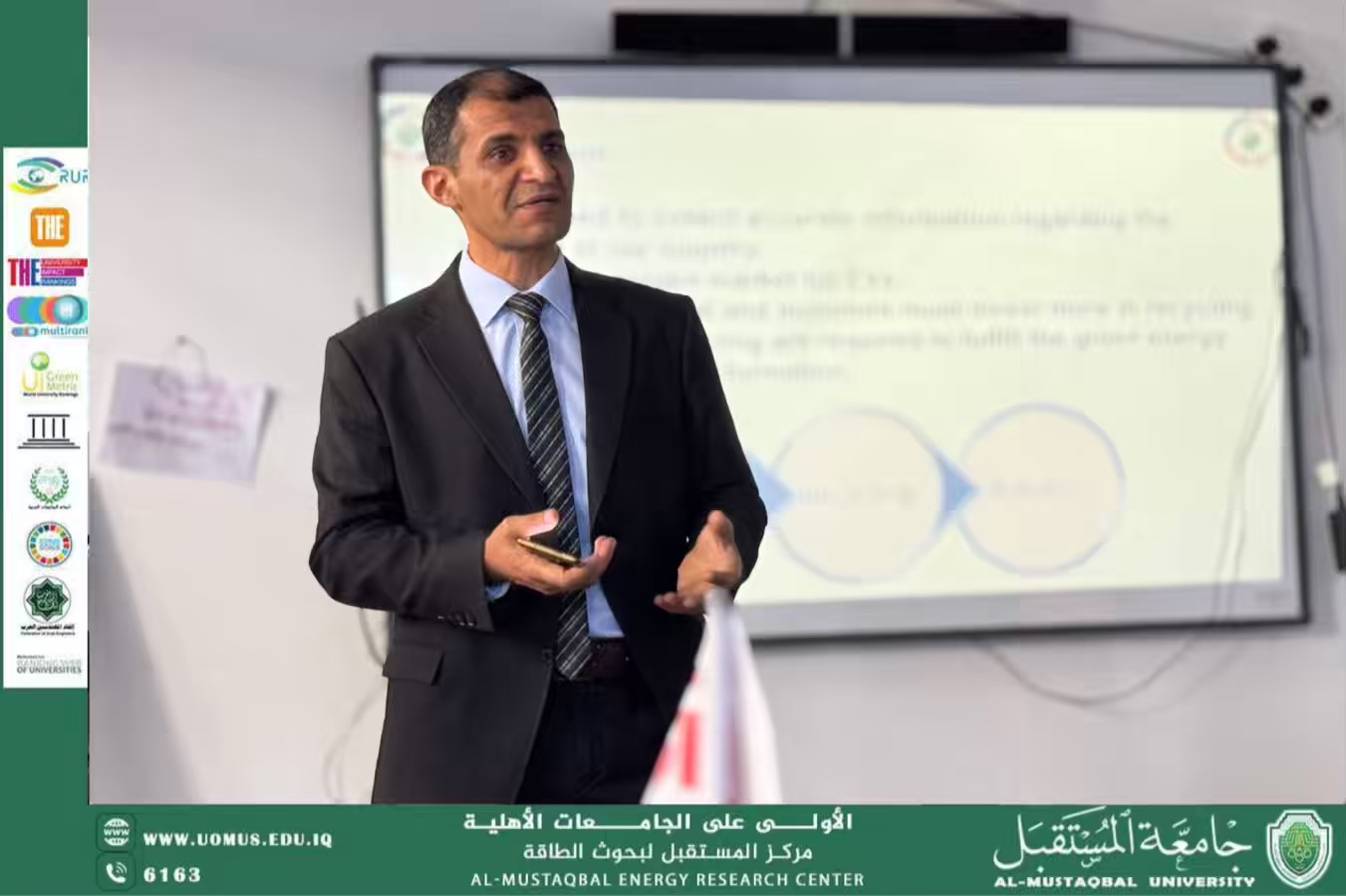 As part of the 4th International Sustainability Week activities, and within the fourth day’s program, the AlMustaqbal Energy Research Centre at AlMstaqbal University organized a scientific workshop entitled: “From Waste to Energy: The Future of Lithium Battery Recycling” The workshop was attended by a number of students, researchers, and individuals interested in the fields of energy and sustainability. It aimed to highlight the importance of recycling lithium batteries and its role in reducing environmental impact and promoting sustainability, in addition to reviewing the latest technologies used in recycling processes and the challenges facing this vital sector. The workshop also covered several topics, including an introduction to lithium batteries and their widespread applications, the environmental risks associated with improper disposal, as well as the economic benefits of recycling and its role in supporting a sustainable energy economy. The session was delivered by: • Dr. Salwan Ubaid Waheed • Dr. Mohammed Maytham Ubaid The workshop witnessed strong engagement from attendees through questions and discussions that enriched the topic and emphasized the importance of adopting sustainable solutions in managing energy waste. This workshop is part of a series of scientific activities organized by the Centre to promote environmental awareness and strengthen the concepts of sustainability and clean energy.
