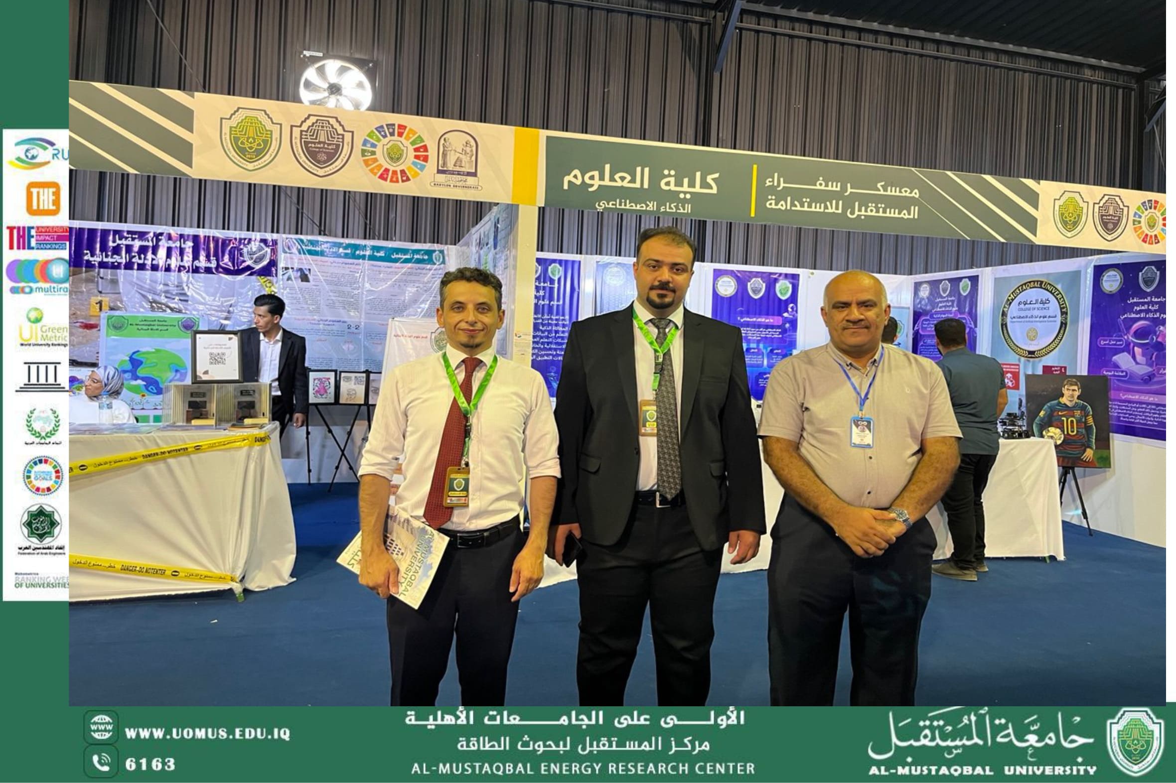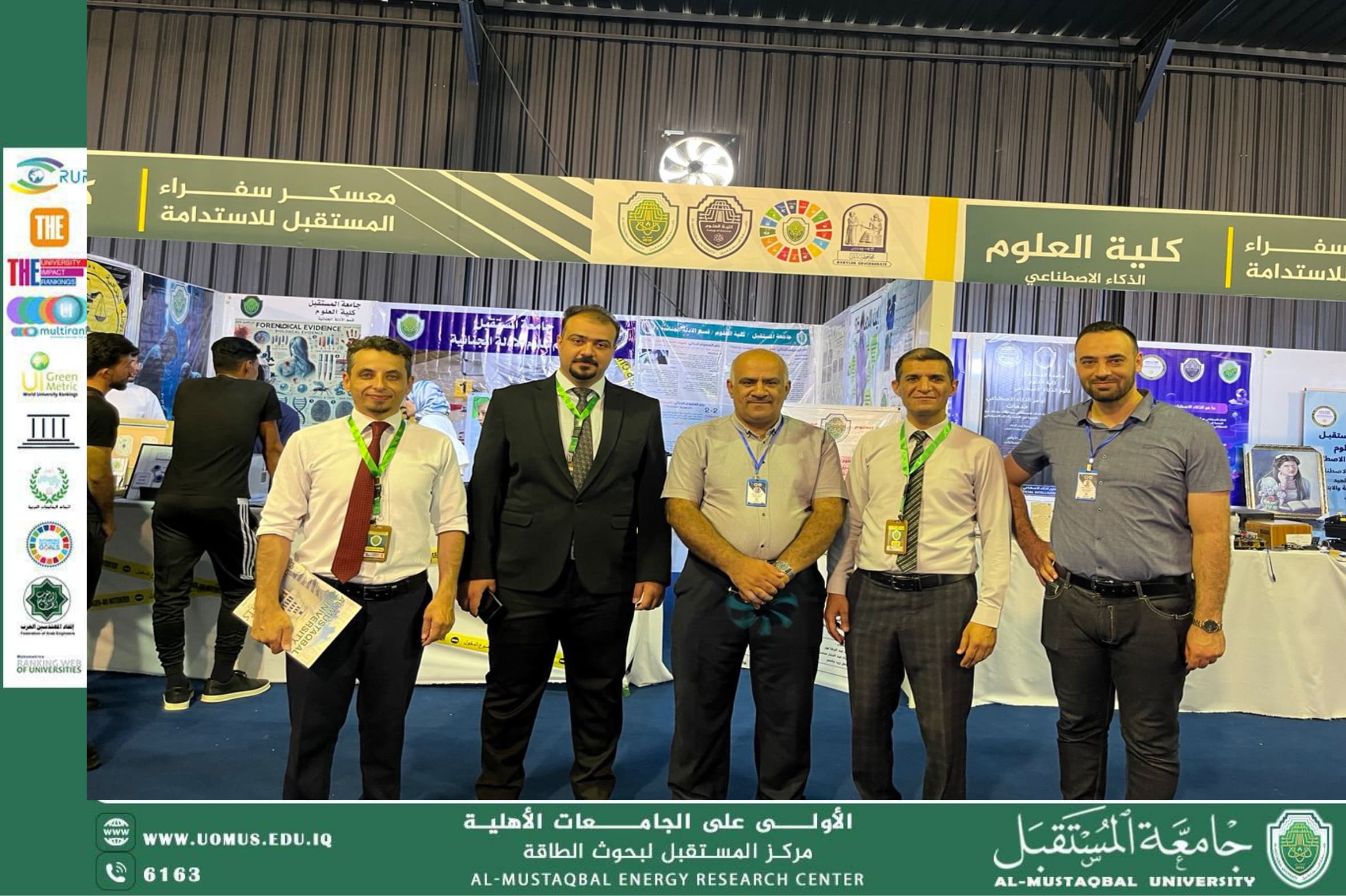 Today marked the launch of the first day of the Future Ambassadors for Sustainability Festival, where the Al-Mustaqbal Center for Energy Research booth welcomed a large number of visitors and university professors who stopped by to explore the latest projects and innovations presented by the center in the field of renewable energy. The booth showcased an outstanding collection of senior graduation projects focused on clean and sustainable energy, along with several technical demonstrations including a robot powered by a solar cell, different types of inverters, energy storage batteries, and solar panels with various wattages. The team provided clear explanations to highlight the importance of these technologies and their real-world applications. This active participation reflects the vision of Al-Mustaqbal University in promoting sustainability awareness, supporting scientific research, and fostering an environment that encourages students to innovate and contribute to shaping a cleaner and more sustainable energy future.