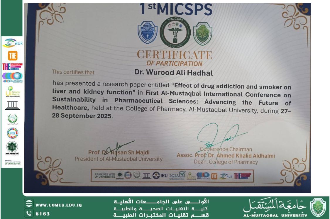 The halls of Al-Mustaqbal University – College of Pharmacy recently witnessed the convening of a scientific conference that brought together researchers, academics, and specialists from various fields of medical and pharmaceutical sciences. Among the distinguished contributions was the participation of Dr. Worood Ali Hethal, faculty member at the Department of Medical Laboratory Techniques, College of Health and Medical Technologies, who presented scientific research and innovative approaches reflecting modern trends in the advancement of health and medical technologies.